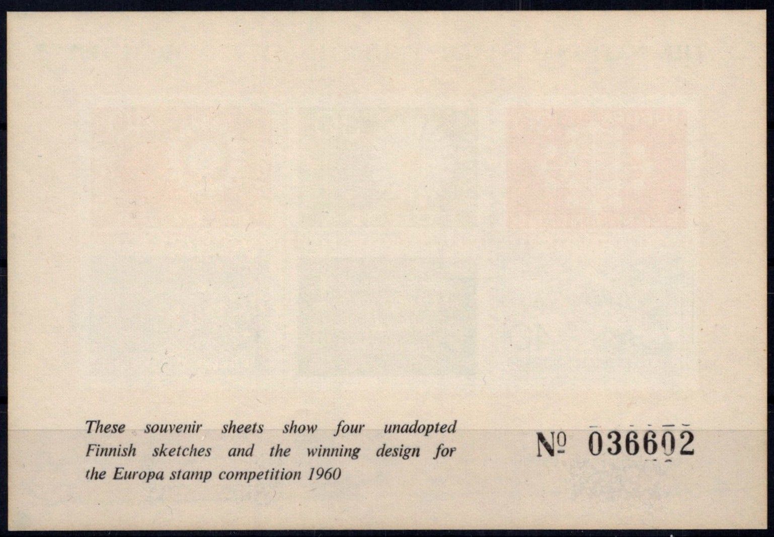 • Feuillet souvenir présentant 4 projets de timbres finlandais non adoptés et le visuel gagnant pour le concours du timbre Europa finlandais de 1960