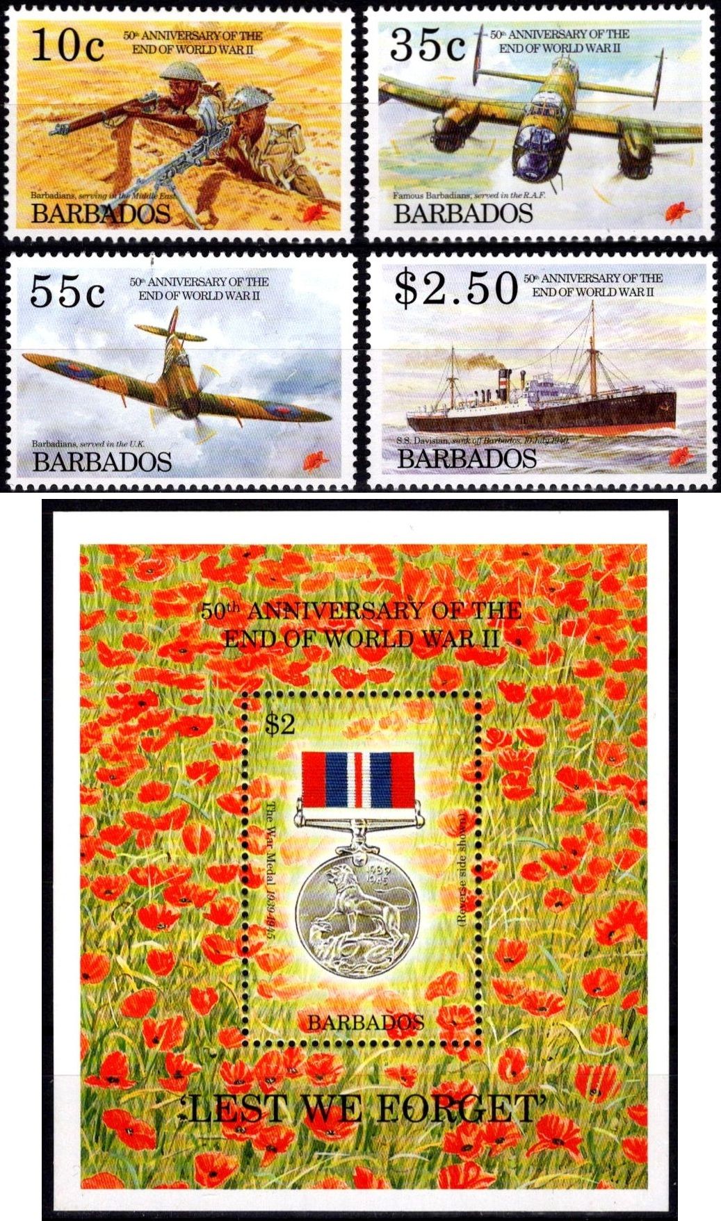 Accueil > Timbres > Timbres du monde > Pays > Amérique > Barbades > 1995 - Barbade Timbres n° 908/911 et Bloc n° 32 - 50e anniversaire de la fin de la seconde guerre mondiale